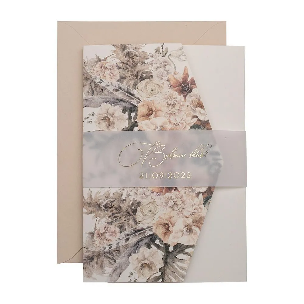 Wesele organizowane w nowoczesnej stodole, nad jeziorem, w ogrodzie lub w innym, malowniczym plenerze aż prosi się o lżejsze w formie zaproszenia ślubne, inspirowane stylem boho lub rustykalnym. Idealnym wyborem są projekty z motywami roślinnymi i kwiatowymi, utrzymane w delikatnych kolorach: beżowym, zielonym czy brązowym. Pomogą stworzyć ciepły, naturalny klimat. Ekologiczny papier, sznurek jutowy oraz koperta kraftowa będą dodatkową zapowiedzią swobodnego charakteru uroczystości.